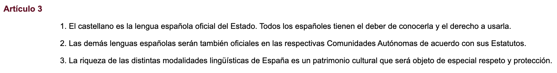 Lengua cooficial: recogidas en el artículo de la constitución española de 1978, son las lenguas que conviven con el castellano en algunas autonomías y que tienen la misma función y derechos que la lengua oficial. El gallego en Galicia, el euskera en País Vasco y parte de Navarra, el catalán en Cataluña, Comunitat Valenciana e Illes Balears son ejemplos recogidos en la carta magna. Algunos dialectos como el asturiano en Asturias o el aranés en la Vall d'Aran están manifestando un auge en los últimos años que les puede convertir en nuevas lenguas cooficiales en sus respectivos territorios.