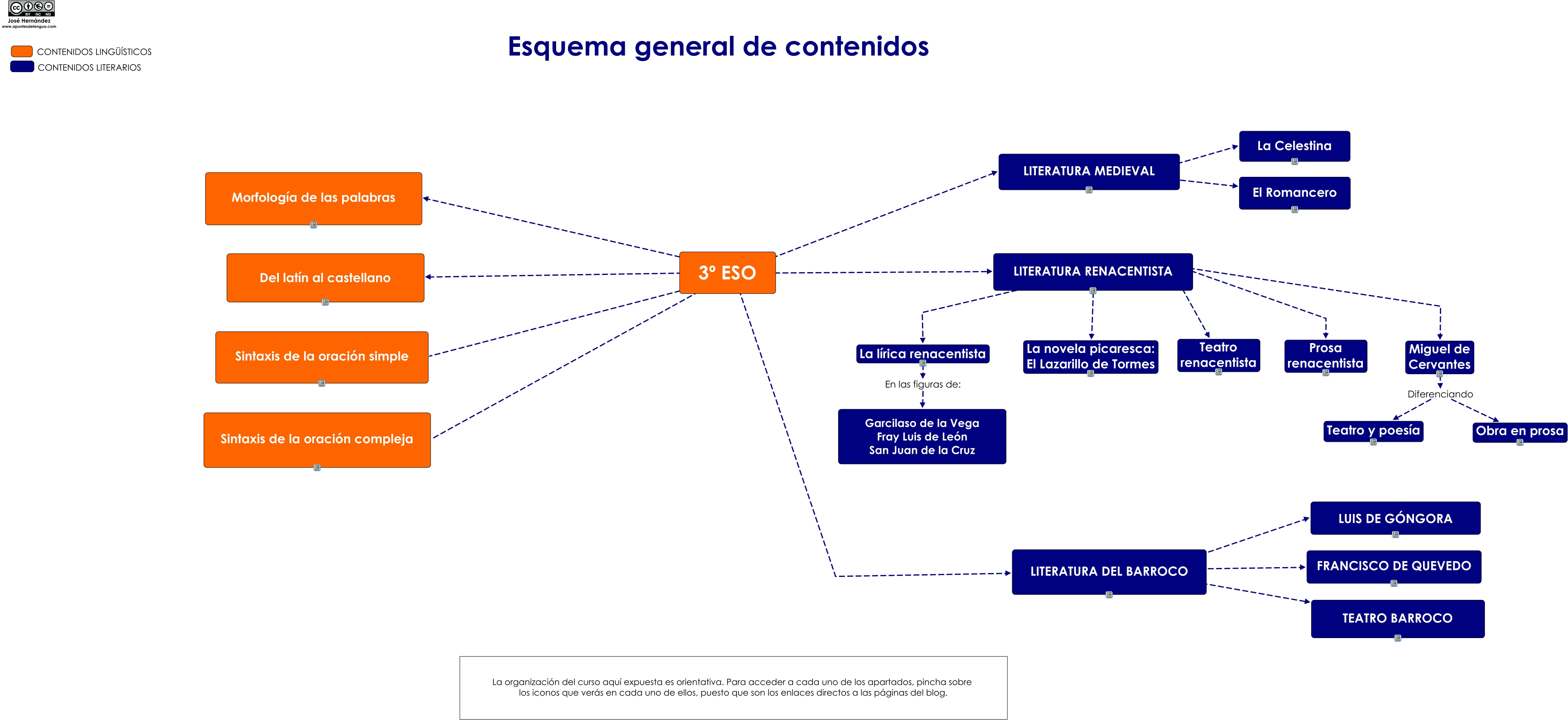 Os presentamos a continuación el mapa conceptual con todos los contenidos del curso académico de 3º ESO. En él encontraréis bien diferenciados los contenidos lingüísticos y literarios. Pincha sobre la imagen y accederás a la información de cada uno de ellos. Recuerda que encontrarás información y enlaces en cada globo, con lo que podrás acceder a recursos y ejercicios seleccionados.